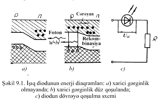 qeyri-əsas yükdaşıyıcılarm ifrat konsentrasiyasmm azalmasının intensivliyi onların ilkin konsentrasiyasma mütənasibdir. Ona görə düz cərəyan artdıqca injeksiya prosesi daha aktiv gedir və daşıyıcıların ilkin konsentrasiyası daha yüksək olur. Ən geniş tətbiq olunan qırmızı, yaşıl və sarı işıq saçan diodlardır. İşıq diodunun dövrəyə qoşulma sxemi şəkil 9.1c-də göstərilmişdir. Müqavimət diodun dövrəsindəki cərəyanı məhdudlaşdırır. Diodun cərəyanı və onda düşən gərginlik düşküsü belə təyin edilir.